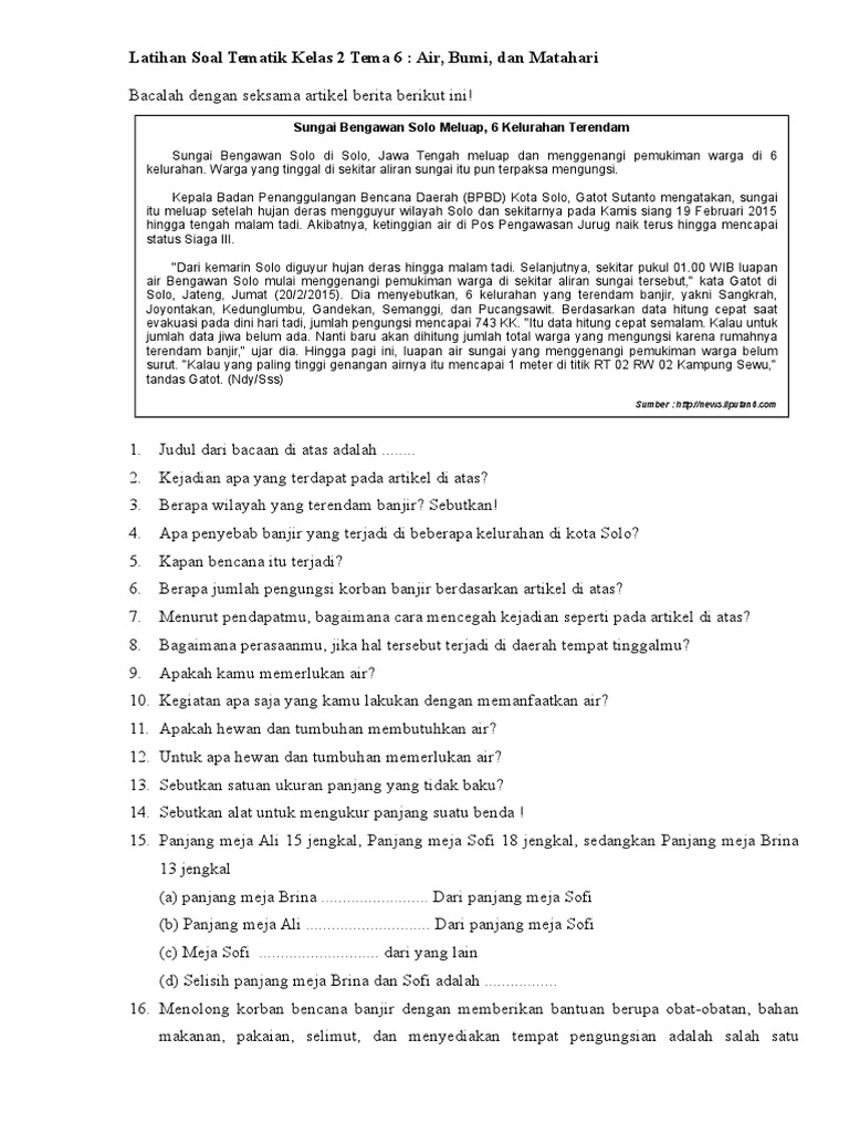 Soal tematik kelas 2 tema 6 subtema 1 dan 2 semester 2 ini dapat dijadikan acuan oleh bapak/ibu guru untuk memberikan penilaian tengah semester tahun 2019 ini. Sahabat ahzaa, kali ini saya akan membagikan soal latihan tematik kelas 2 (dua) sd tema 7 yaitu kebersamaan dengan subtema 2 kebersamaan di sekolah. Soal semester 2 tematik kelas 5 sd tema 6 subtema 2 organ tubuh manusia dan hewan. Subtema 2 merawat hewan di sekitarku. Berilah tanda silang (x) pada jawaban yang benar!